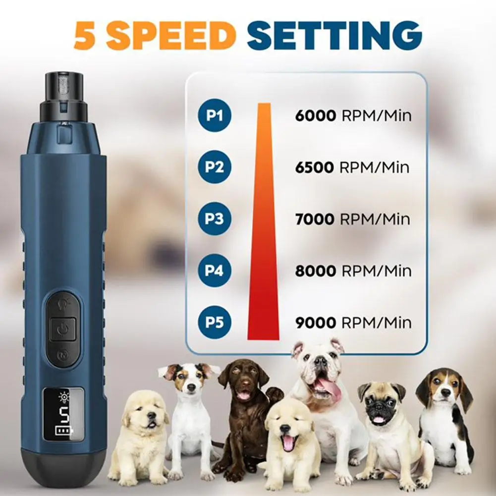 3.Five speeds, suitable for any pet or nail: Customize the power to the pet's needs. It features five adjustable speed and difference-sized interfaces, capable of gently handling all breeds and nail types, from small cats to large dogs with thicker nails. Fast and efficient